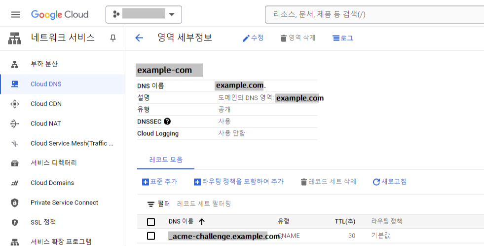 GCP Console에서 작업 가능: Cloud DNS > example.com > 레코드 모음 > 표준 추가